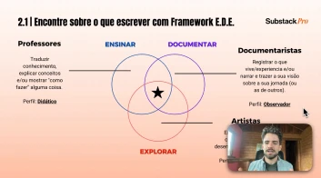 Além das vídeo-aulas, você recebe o material com a apresentação completa do curso, um framework prático para personalizar, preencher e adaptar para o seu Perfil/Newsletter no Substack.