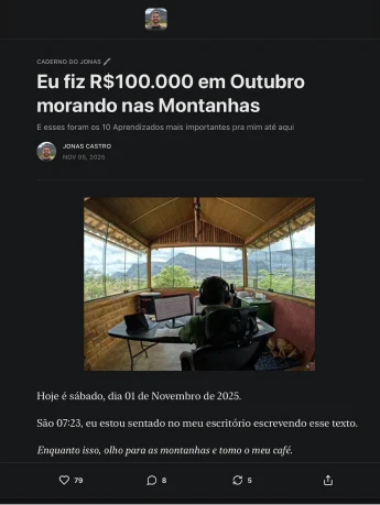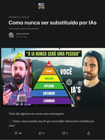 O Jonas é um cara que consegue unir o a inspiração, entretenimento e entrega de informação de uma forma única. O que mais me impressionou em como ele lida com o Substack foi a ligação que ele faz entre o YouTube e a Newsletter, aproveitando o tráfego e ideias. Como ele envolve as pessoas no seu conteúdo principal (blog) através das notas, mostrando o processo, pensamentos rápidos, o que está por vir, bastidores, ideias nuggets, etc. E a profundidade que ele entrega e mostran como que isso se conecta com o nosso porquê.